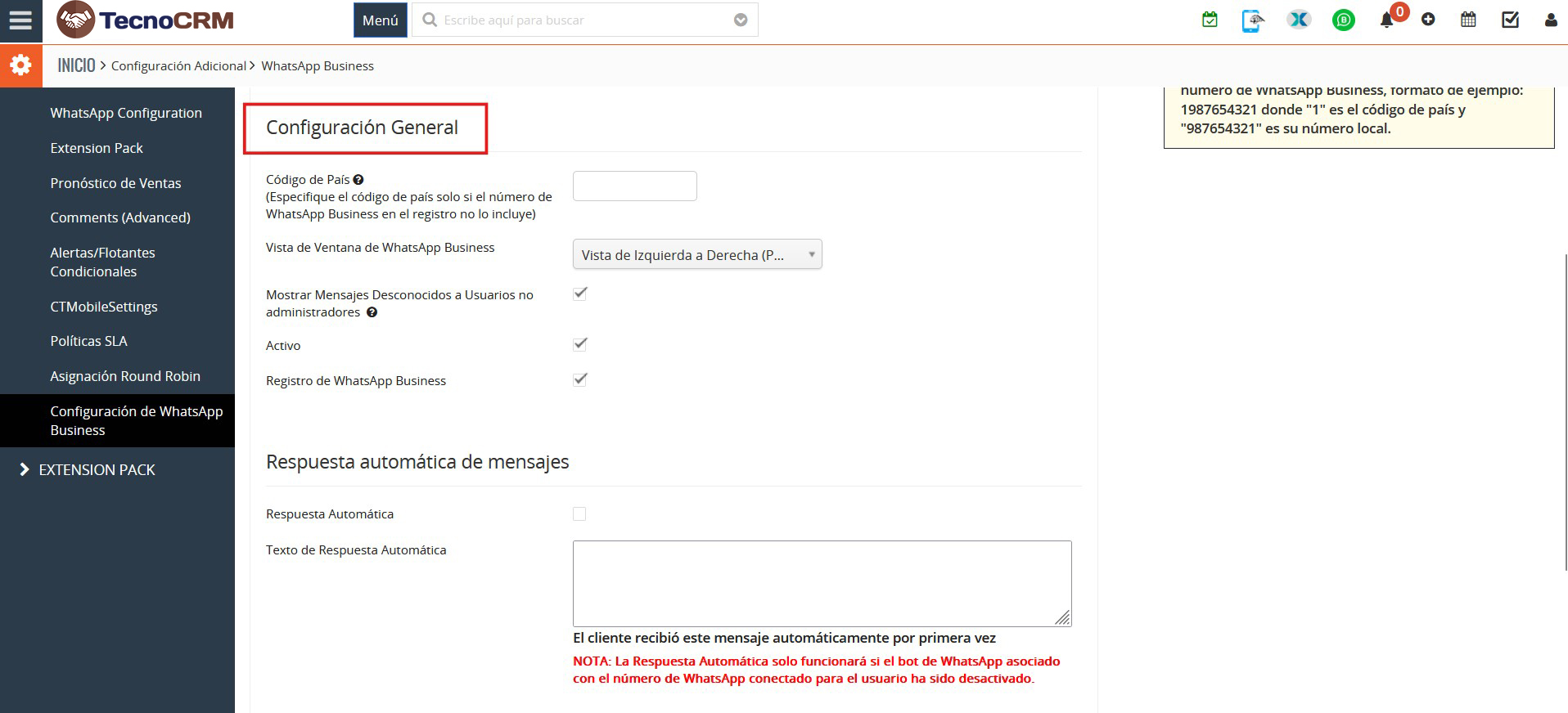 En Ajustes generales, puedes configurar el código de país, la vista de la ventana de WhatsApp Business, el acceso para mostrar mensajes desconocidos a usuarios no administradores y mostrar el estado indicando si está activo o no.