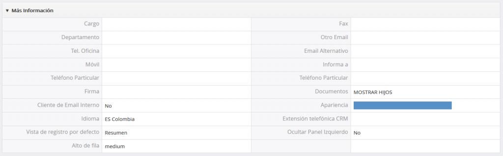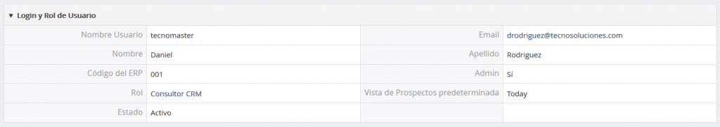 Estado: Este campo muestra si un usuario está activo (solamente es importante para los administradores). No se permite a los usuarios inactivos ingresar al sistema TecnoCRM. Este campo no se puede cambiar por un usuario sino solamente por el administrador.