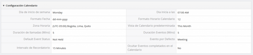 Configuración Calendario: