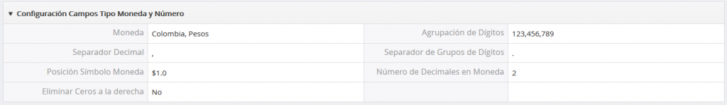 Configuración Campos Tipos de Moneda y Números: