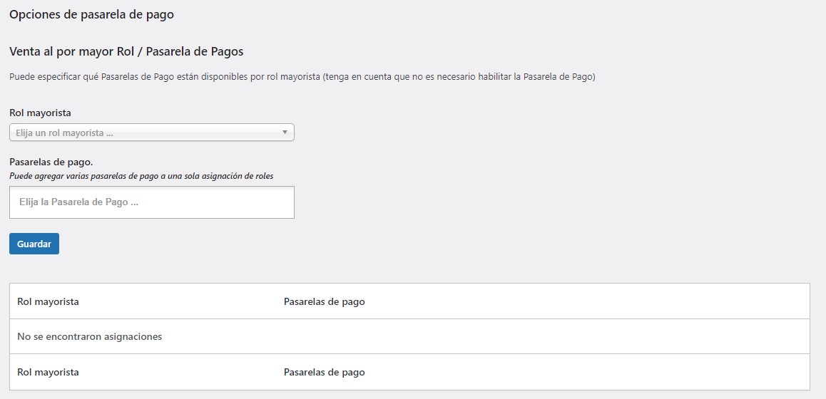 Cuando se detecta un usuario mayorista, consultamos el mapeo que configuraste en esta interfaz para determinar qué opciones de pasarela de pago deberían ver al finalizar la compra.