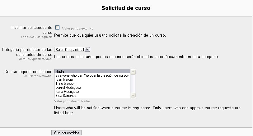 A los usuarios se le notificará cuando se solicita un curso. Sólo los usuarios que puedan aprobar las solicitudes de curso figuran en esta lista.