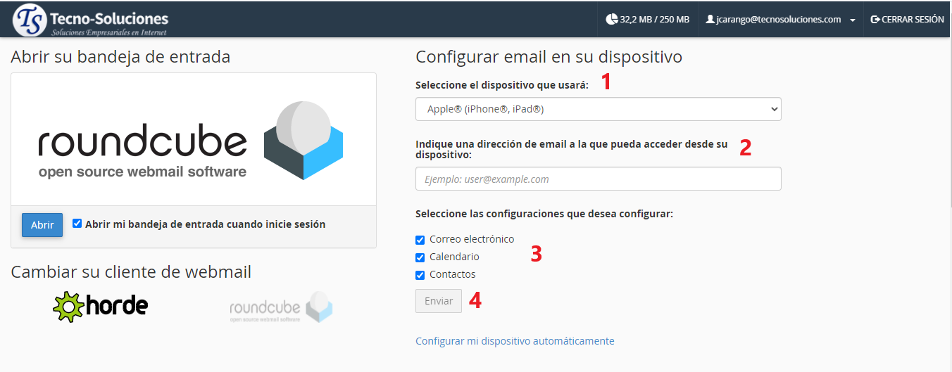 Esta sección le permite configurar su cuenta de Webmail en cualquier dispositivo electrónico con aplicaciones de correo electrónico. Para enviar un correo electrónico con instrucciones de configuración, realice los siguientes pasos: