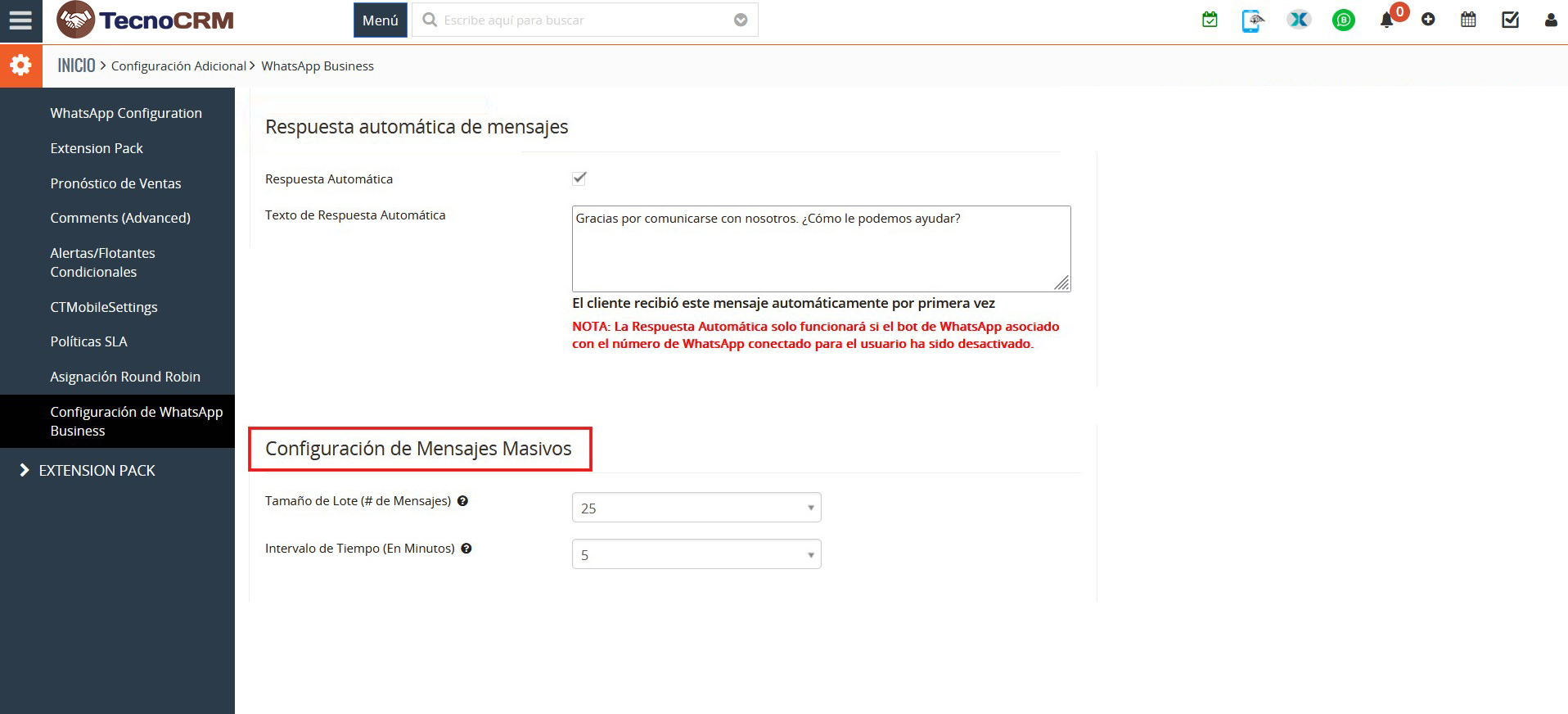 - PRECAUCIÓN: El envío masivo de mensajes publicitarios según la política de WhatsApp Business está PROHIBIDO.