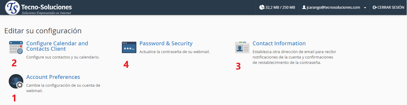 Esta sección de la interfaz de Webmail incluye funciones que editan su configuración.