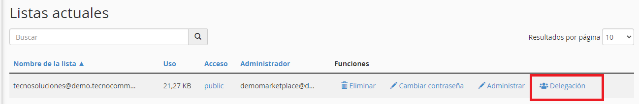Para administrar la configuración de delegación en una lista de correo, haga clic en Delegación para esa lista de correo.