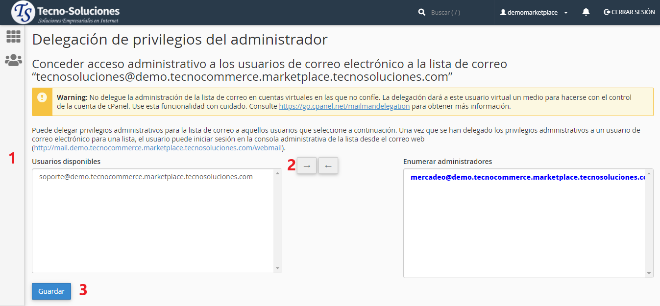 Para delegar derechos administrativos en una lista de correo, realice los siguientes pasos: