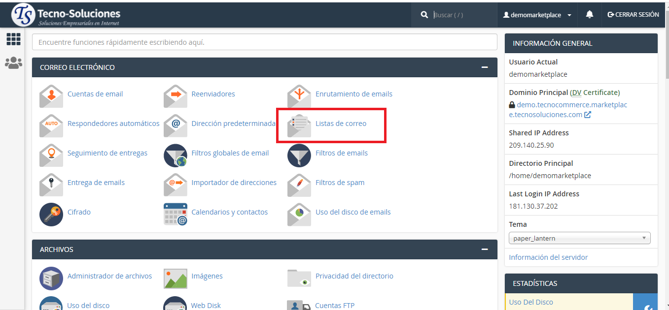 Las listas de correo le permiten usar una sola dirección para enviar correo a varias direcciones de correo electrónico. cPanel maneja listas de correo con la aplicación Mailman de terceros. Para obtener más información, lea la documentación de Mailman .