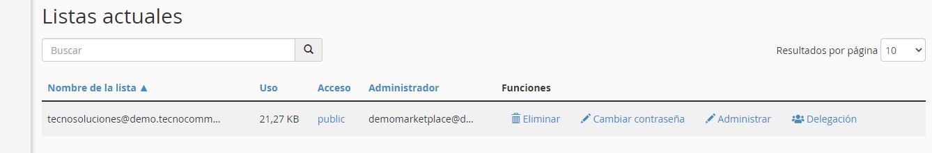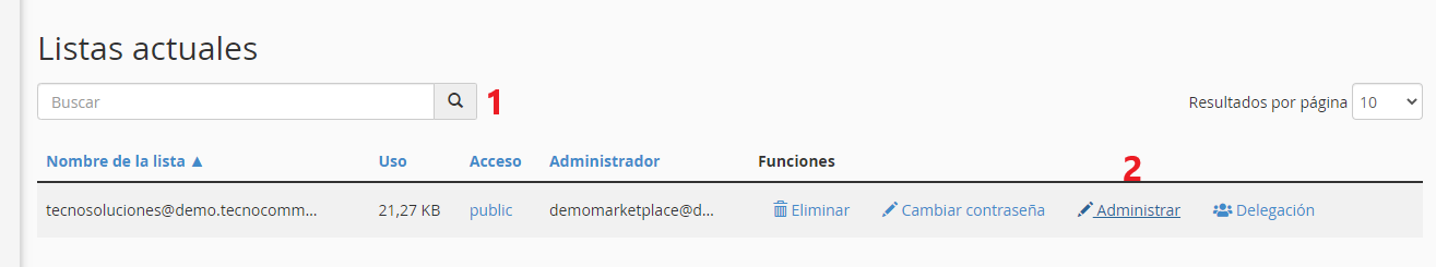 La sección Listas actuales de la interfaz muestra las listas de correo de la cuenta. Para buscar una lista de correo, ingrese una palabra clave en el cuadro de texto Buscar .