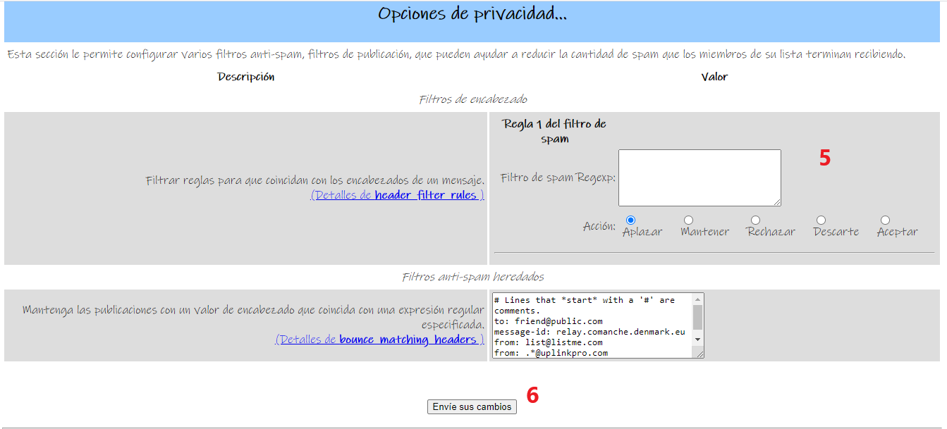 Para obtener más información sobre la función de filtros de correo no deseado de Mailman , lea la documentación de Mailman .