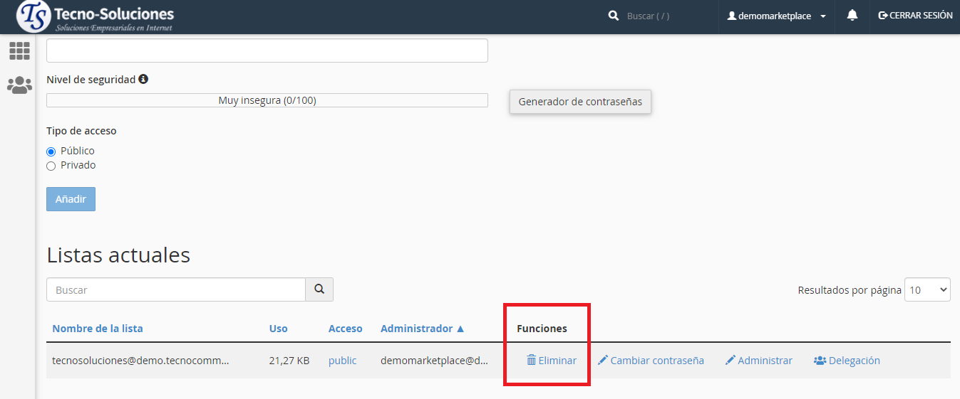 Después de crear una lista de correo, use las siguientes funciones para modificar, eliminar o cambiar la contraseña.