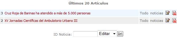 - Noticias Recientes: Lista los 20 artículos / noticias publicados recientemente en el Portal, presentando por cada noticia opciones para Borra / Editar. También es posible editar / borrar una noticia no incluida en el listado ingresando el ID de la misma en el campo correspondiente y haciendo clic en “Ir”. A continuación un ejemplo: