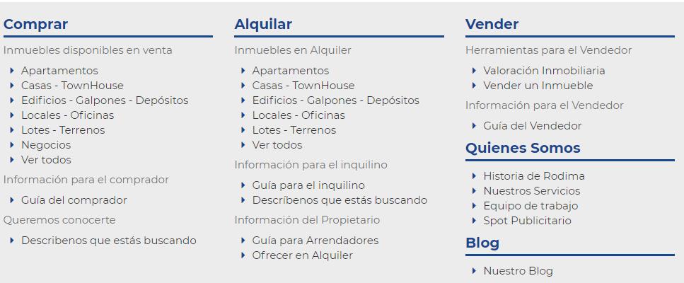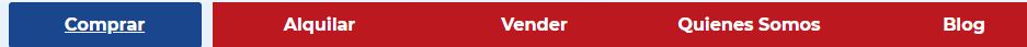 Seguidamente, hay un menú con los siguientes elementos: Inicio, Comprar, Alquilar, Vender, o lo referente a la búsqueda de inmuebles; Quiénes somos y Blog en algunos casos