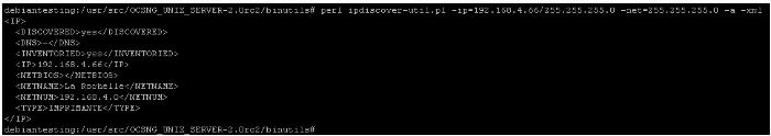 Puede realizar una solicitud para escanear una dirección IP específica para obtener información sobre un host. En el directorio tarball binutils del servidor linux, el script de perl es ipdiscover-util.pl. Utiliza las utilidades NMAP y NMBLOOKUP para obtener información sobre el host (nombre DNS, NetBios,…) y también para ver si el host está inventariado/descubierto.