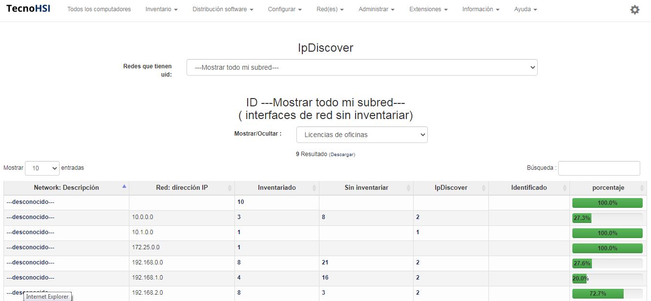 Para cada red, podrá ver cuántos hosts inventariados, hosts no inventariados, hosts habilitados para la función IPDISCOVER y hosts identificados (hosts conocidos registrados manualmente en la base de datos) están conectados a esta red.