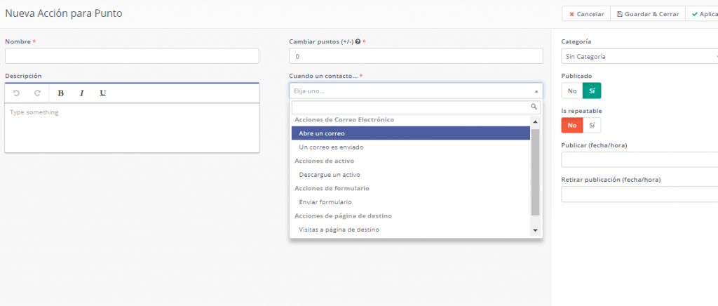 Las acciones de puntos son aquellos momentos en que un contacto recibe un cambio en su puntaje total. Estas acciones pueden ser positivas o los puntos cambian a negativos y se basan en una acción particular que usted determina.