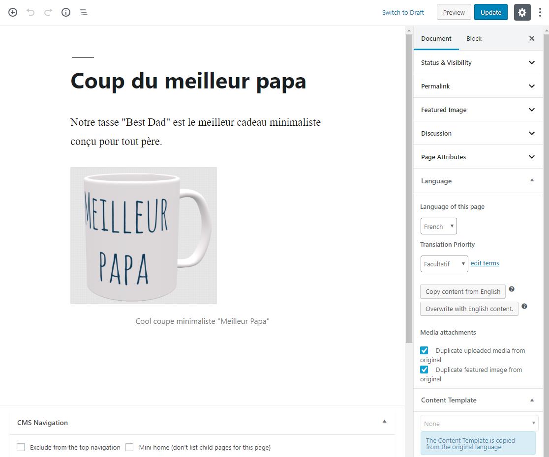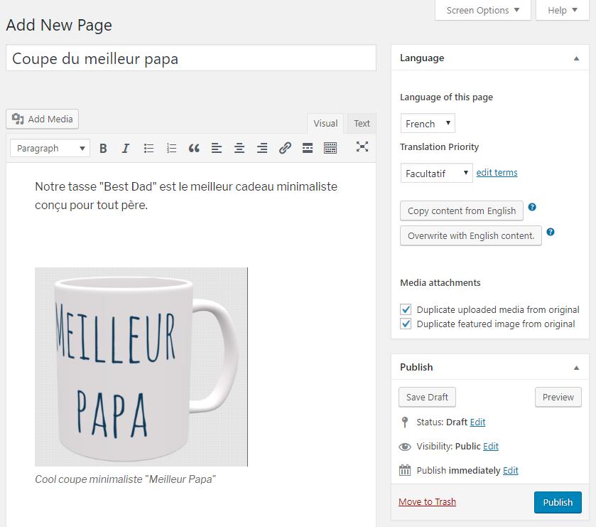Para comprender cuándo es necesario recurrir al plugin de Traducción multimedia, primero debe ver cómo traducir imágenes sin el mismo. El plugin principal de WPML permite traducir manualmente las imágenes y los recursos multimedia de su contenido. En este caso, usted los traduce como cualquier otra parte de sus páginas.