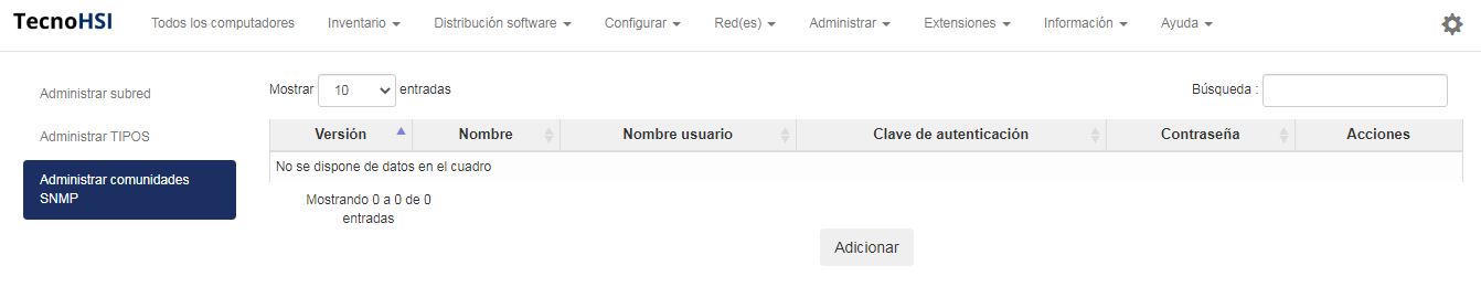 Si configura sus propias comunidades SNMP en sus dispositivos SNMP, debe agregarlas en la configuración de TecnoHSI. El agente de OCS recibirá información sobre estas comunidades e intentará escanear los dispositivos SNMP utilizando todas las comunidades SNMP que establezca en la consola de administración. La información de las comunidades SNMP se agrega directamente a la base de datos.