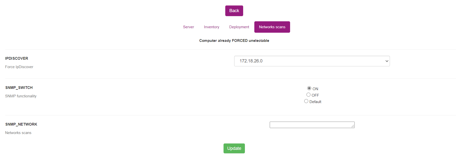 - Puede habilitar/deshabilitar una computadora para realizar escaneos SNMP usando la opción SNMP_SWITCH. De forma predeterminada, se toma el parámetro de configuración global, correspondiente al botón de opción Predeterminado.