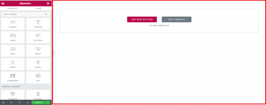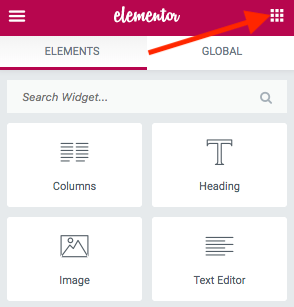 El panel ubicado en el lado izquierdo de la pantalla y contiene herramientas creativas llamadas widgets que le permiten agregar elementos a su página. Algunos de los widgets más comúnmente utilizados incluyen encabezado, editor de texto, botón, imagen, video y más.