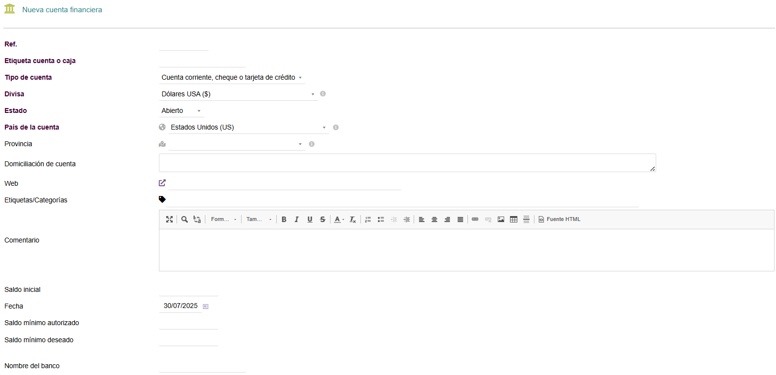 - Nueva Cuenta bancaria: En esta pantalla introduciremos los datos de la cuenta que vamos a crear. Luego de introducir los datos, se crea la ficha de la cuenta bancaria creada.