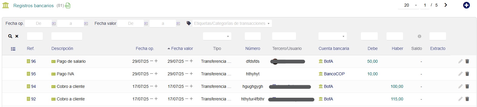 Como se puede observar, tiene un avanzado buscador por fechas, Ref, Etiquetas/Categorías, Descripción, Cuenta bancaria, etc.
