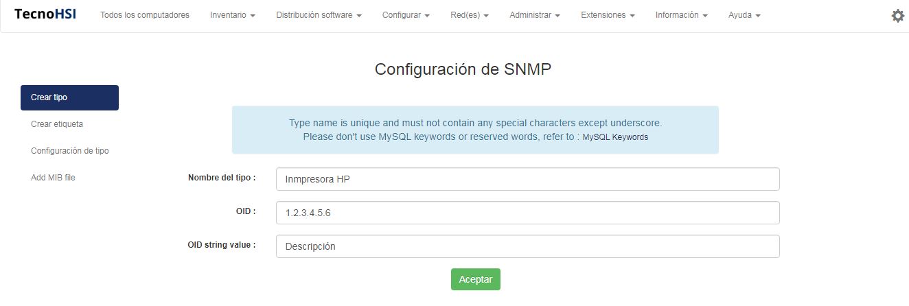 Primer paso, cree un nuevo tipo. Tipo de SNMP correspondiente al dispositivo que desea inventariar como impresora, conmutador, etc.