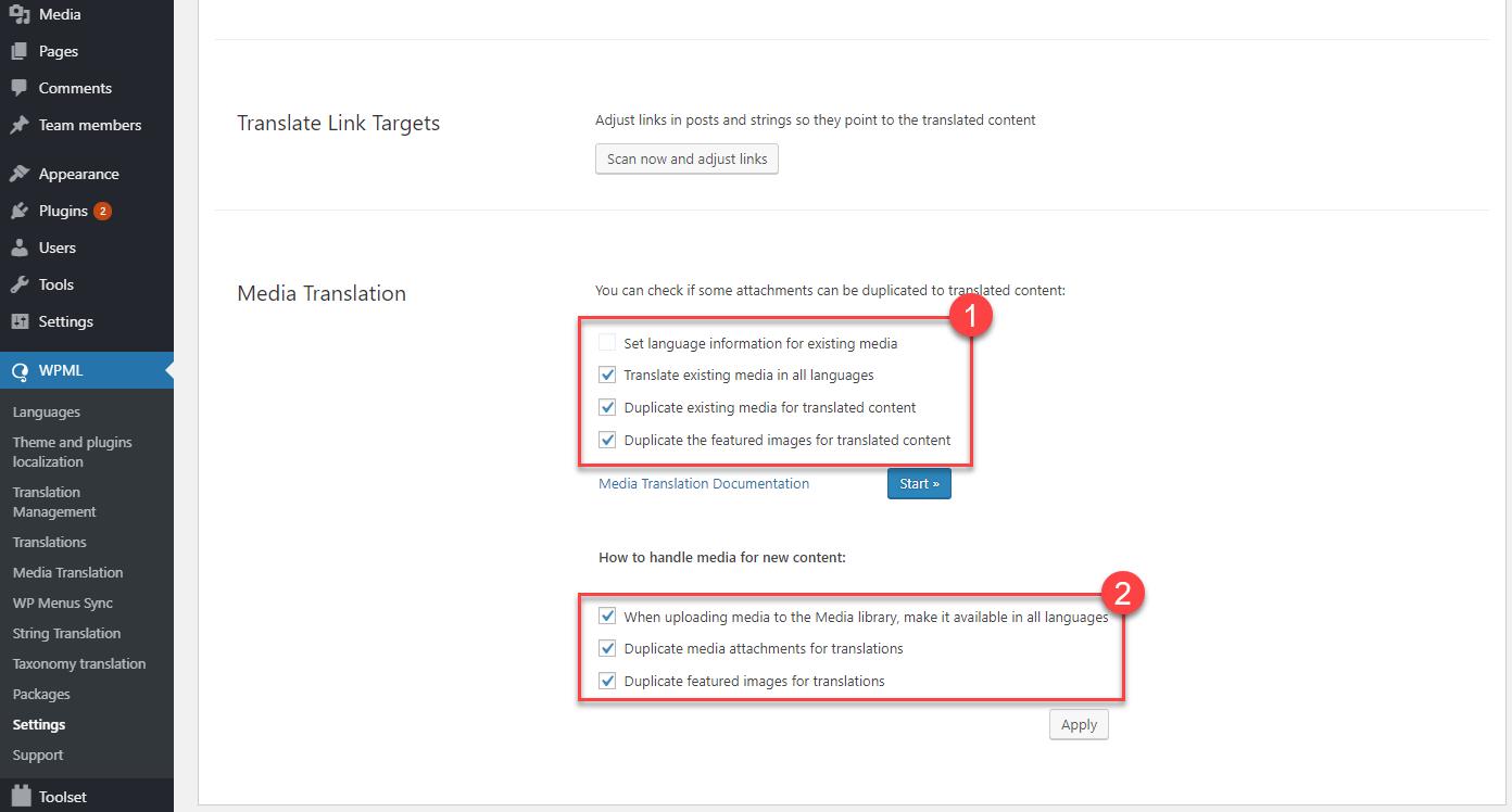 Las opciones para traducir recursos multimedia se encuentran en la parte inferior de la página WPML -> Ajustes.