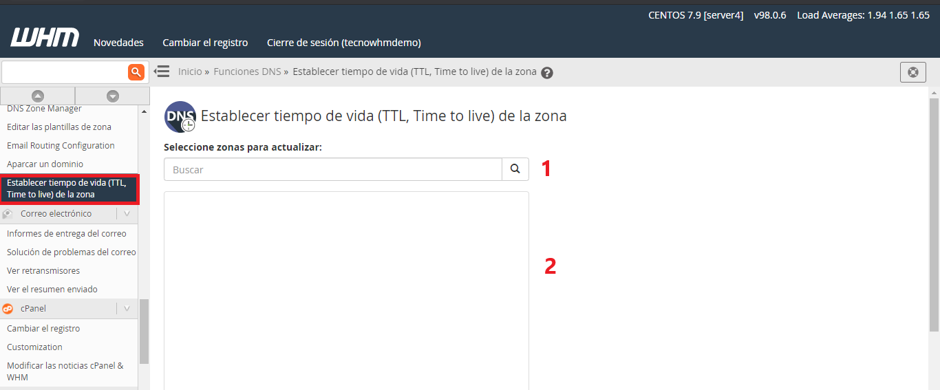 Esta interfaz le permite establecer el valor del tiempo de vida (TTL) en las zonas DNS de su servidor. El TTL especifica cuánto tiempo un servidor DNS almacena en caché un registro antes de solicitar una actualización del servidor de nombres autorizado, medido en segundos.