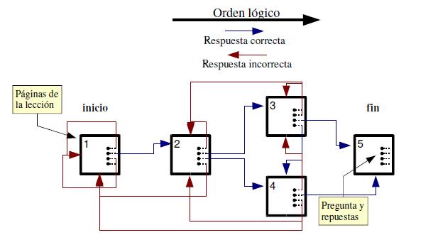Para cada lección existirá un orden lógico, que es el orden en el que habrían de recorrerse las páginas contestando correctamente a las diferentes preguntas, el orden natural del texto según su lógica interna a los ojos del profesor. El orden lógico es el orden en el que el profesor organiza las páginas. De hecho, y de cara a la especificación informática de una lección, es este orden el que determina qué respuestas son “correctas” o “incorrectas”. Como indica la Figura 53, una respuesta que conduzca a una página anterior (o a la misma página que la contiene) será una respuesta incorrecta. En cambio, las respuestas que hacen avanzar según el orden lógico serán respuestas correctas por definición.