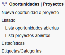 - Listado de oportunidades y proyectos: se muestran tanto las oportunidades como los proyectos ya establecidos. Aparecen dos opciones adicionales para listar solo oportunidades o solo proyectos. El contenido de las listas dependerá de la configuración de cada proyecto/oportunidad y los permisos del usuario.