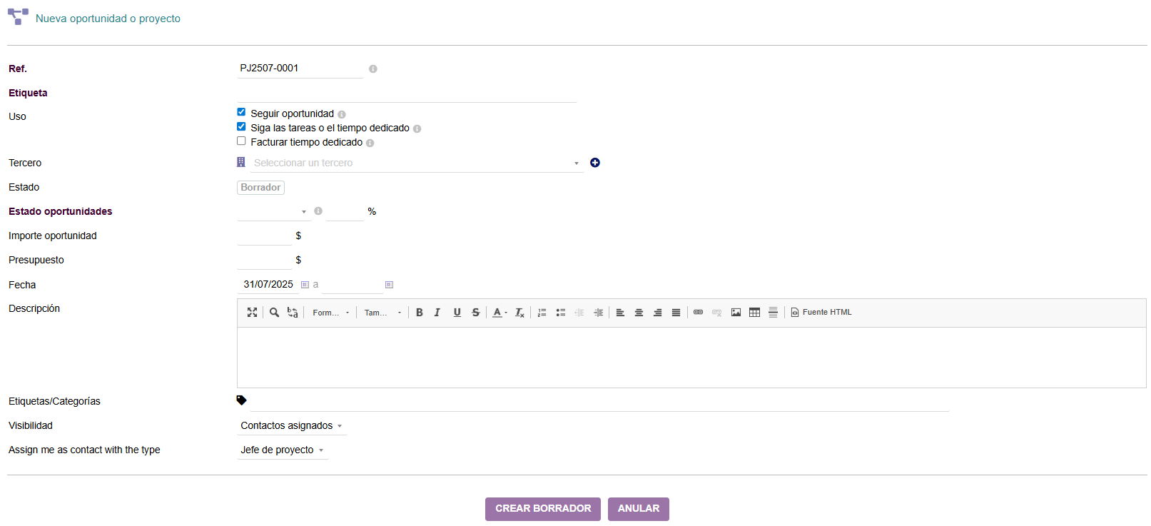 - Visibilidad: si no se modifica, solo será visible para los contactos asignados. Puede cambiarse para ser un proyecto compartido.
