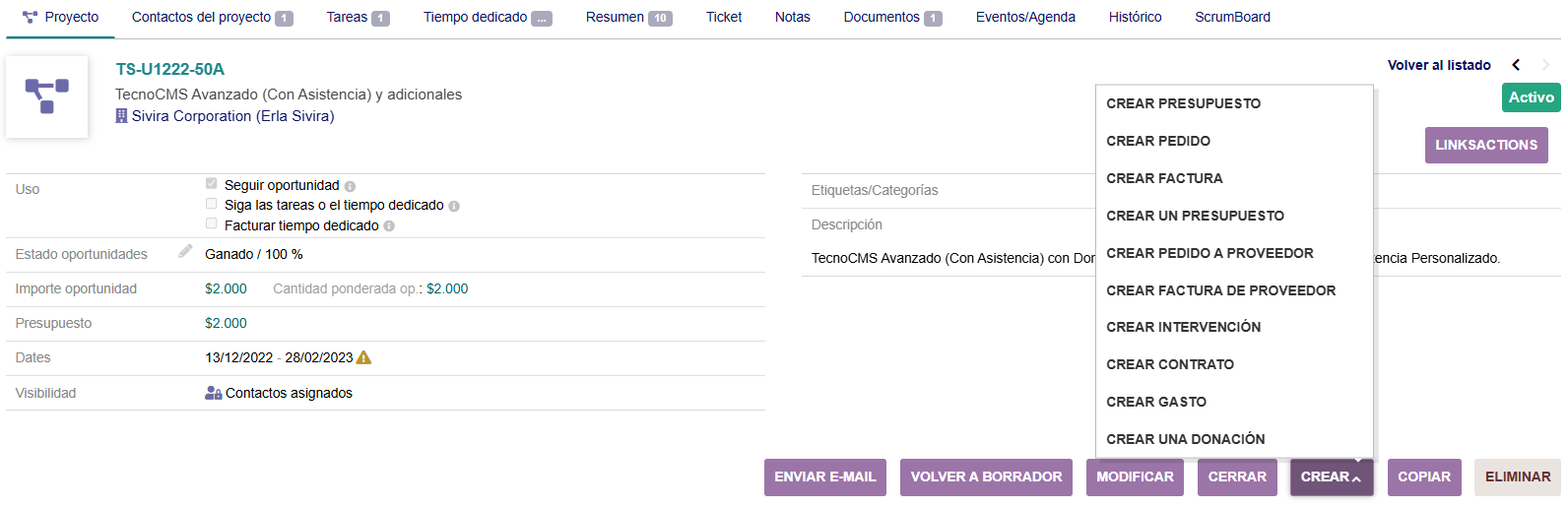 - Ficha de un proyecto: como todo el funcionamiento del TecnoERP, al crear un proyecto se genera su ficha que permite gestionar el proyecto en sí, con sus datos generales, tareas relacionadas, tiempo dedicado, etc. Además, tiene opciones de modificar, crear (facturas, pedidos, contratos, intervenciones, etc.), cerrar, eliminar, etc.