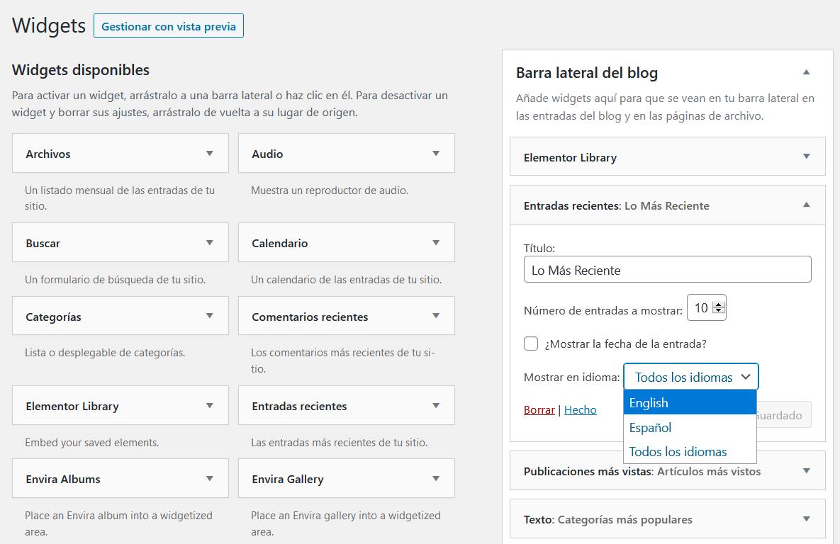 Cada widget tiene una opción de «Mostrar en idioma» con un menú desplegable. Puede seleccionar la opción de mostrar el widget para todos los idiomas o para uno específico. De manera predeterminada, los widgets se muestran en todos los idiomas.