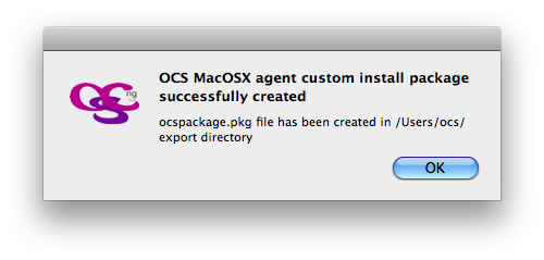 Cuando se haya generado su instalador de agente OCS MacOSX personalizado, aparecerá este mensaje: