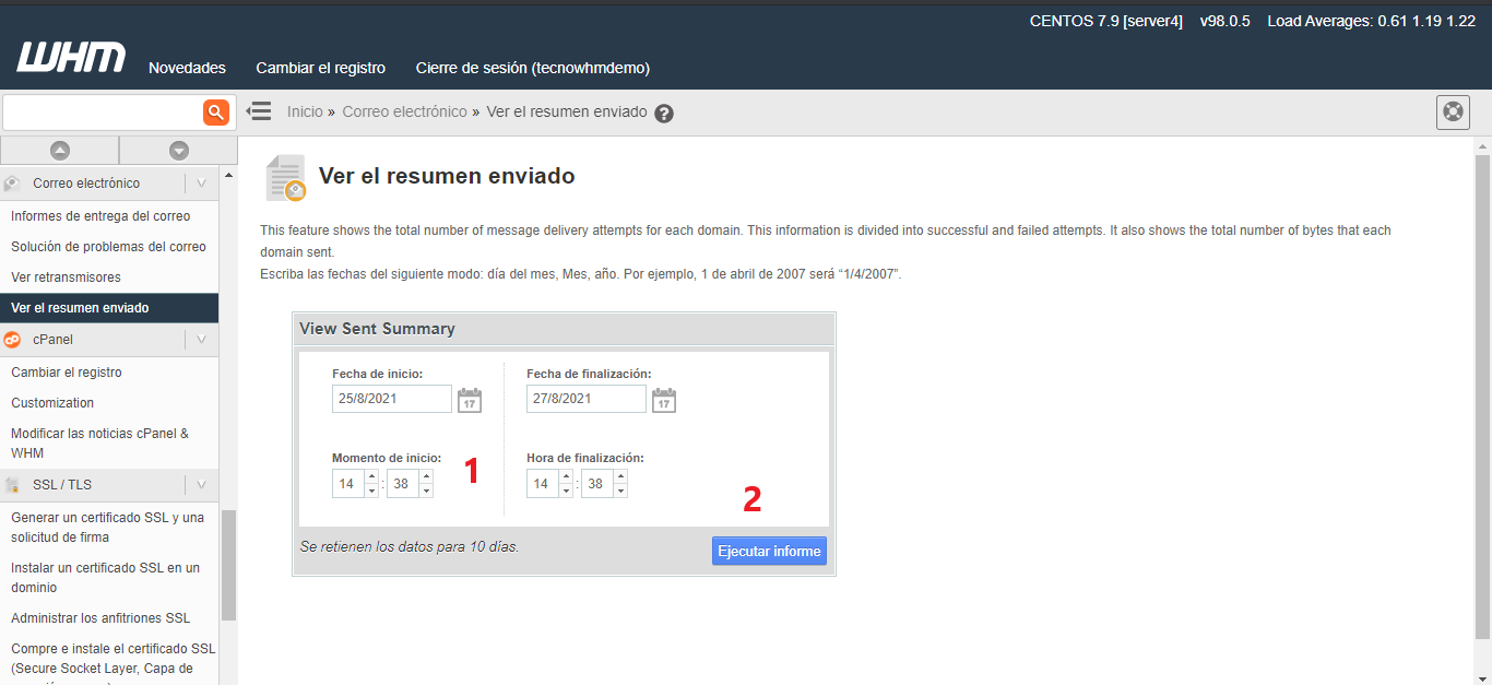 Para ver información sobre los correos electrónicos que los dominios de su servidor enviaron dentro de un intervalo de fecha y hora específico, realice los siguientes pasos: