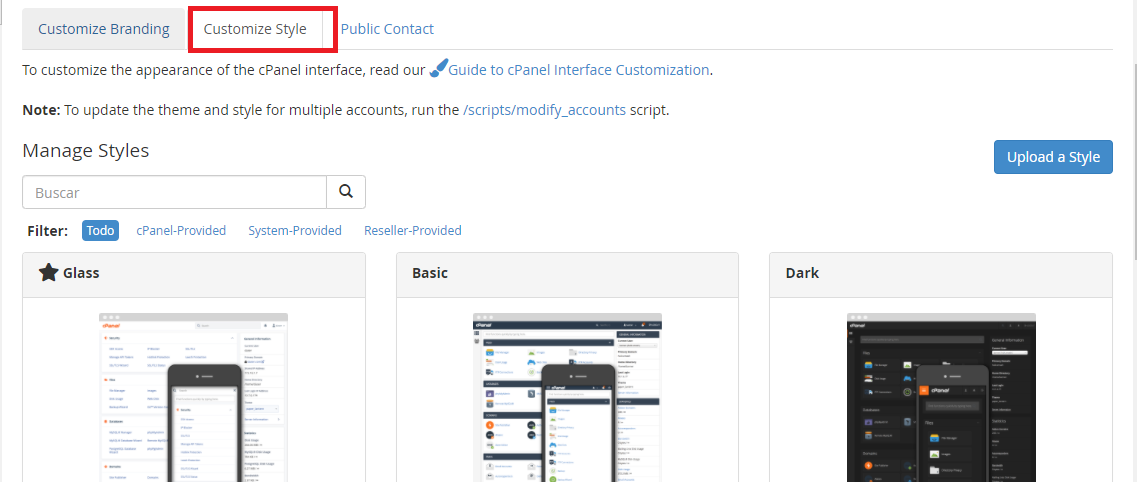 /usr/local/cpanel/scripts/modify_accountsscript.Utilice la sección Administrar estilos para trabajar con estilos. Para filtrar la lista de estilos, haga clic en el nombre del filtro deseado. Para cada estilo, puede realizar las siguientes acciones: