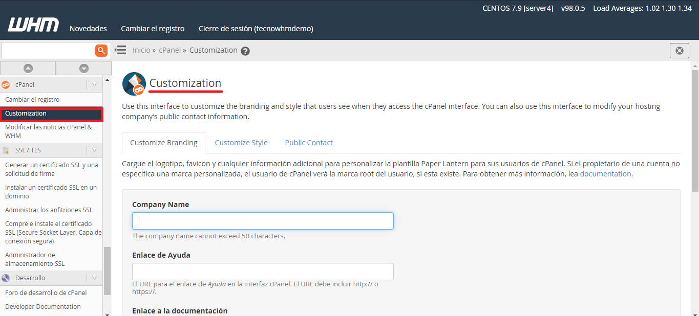 rootusuario han especificado información de marca personalizada, el usuario de cPanel no ve ninguna personalización en la interfaz de cPanel.