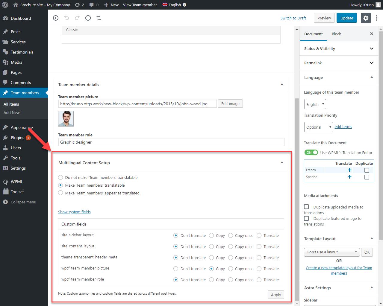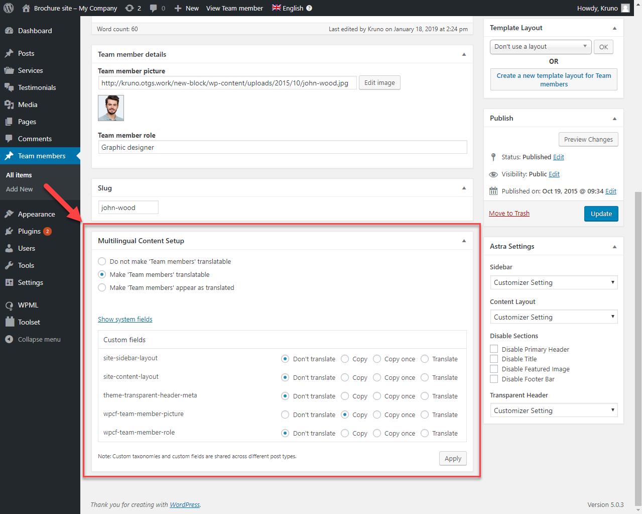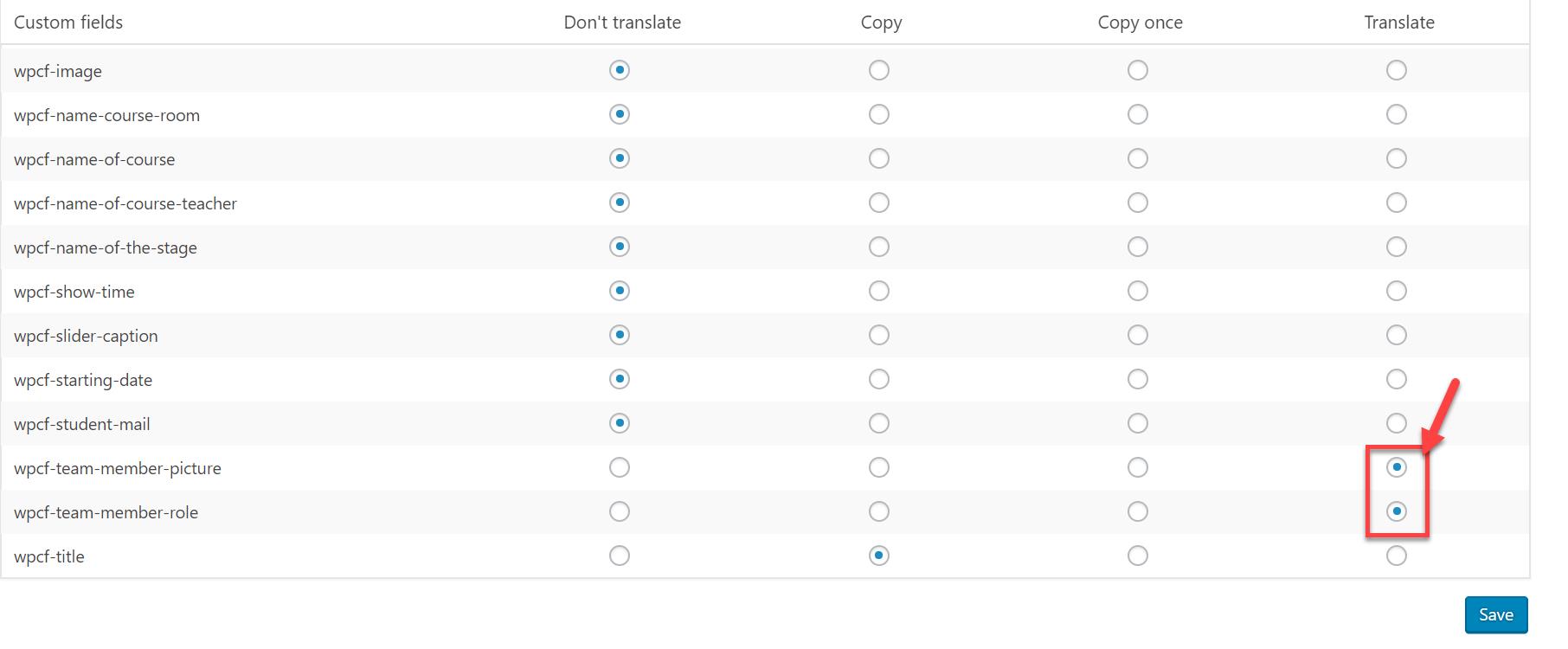 Para poder traducir campos personalizados, debe definirlos como «traducibles» en WPML. Esto se puede hacer de dos maneras diferentes: