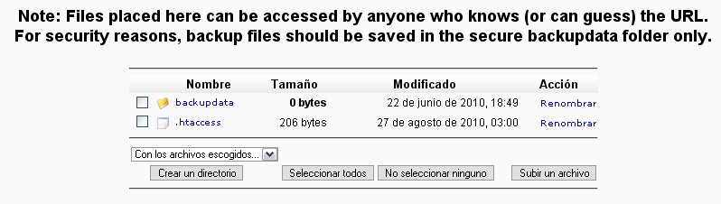 Nota: Los archivos colocados aquí se puede ser accedidos por cualquier persona que sabe (o puede adivinar) la dirección URL. Por razones de seguridad, los archivos de copia de seguridad se deben guardar solamente en la carpeta segura backupdata.