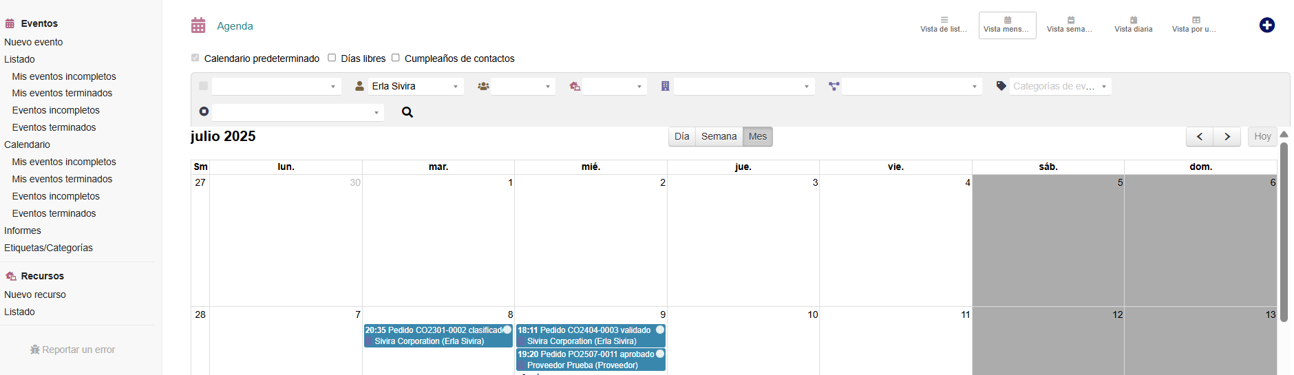 - Desde la parte superior central: podemos filtrar por diferentes parámetros los eventos. Y también podemos seleccionar el tipo de visionado de los eventos: vista de lista, vista mensual, vista semanal, vista diaria y vista por usuario.