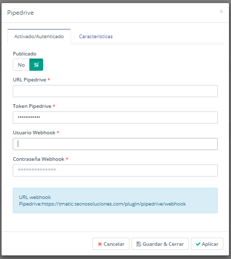 Para integrar TecnoMatic con Pipedrive, complete los siguientes campos: