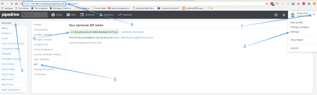 Obtenga la URL de Pipedrive y el token de API de Pipedrive. La URL de la API se parece a su propia URL de Pipedrive, pero usted tiene que agregar/v1 al final. En este ejemplo, la URL se verá así: