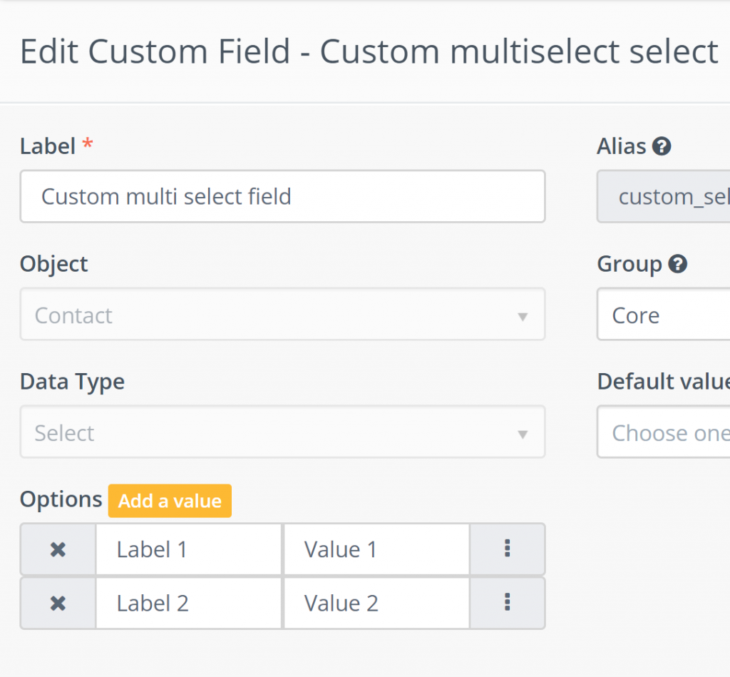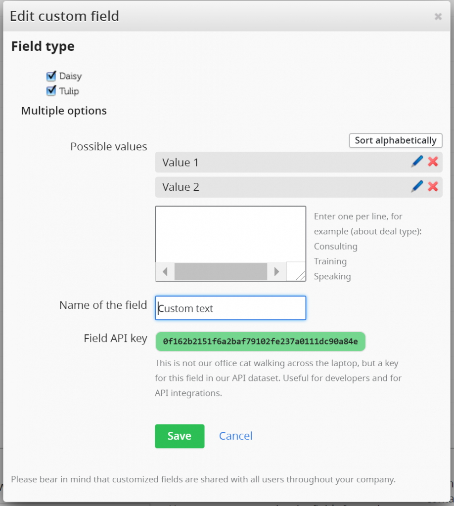 Los valores requeridos de campos personalizados de selección múltiple en la configuración de TecnoMatic son iguales a las etiquetas de Pipedrive.
