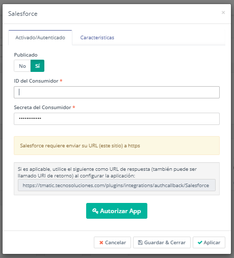 Inserte las claves del complemento TecnoMatic Salesforce y autorícelo.