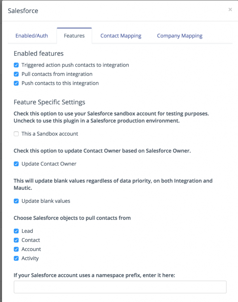 Características habilitadas: puede extraer clientes potenciales y/o enviar clientes potenciales desde y hacia la integración.