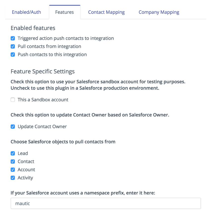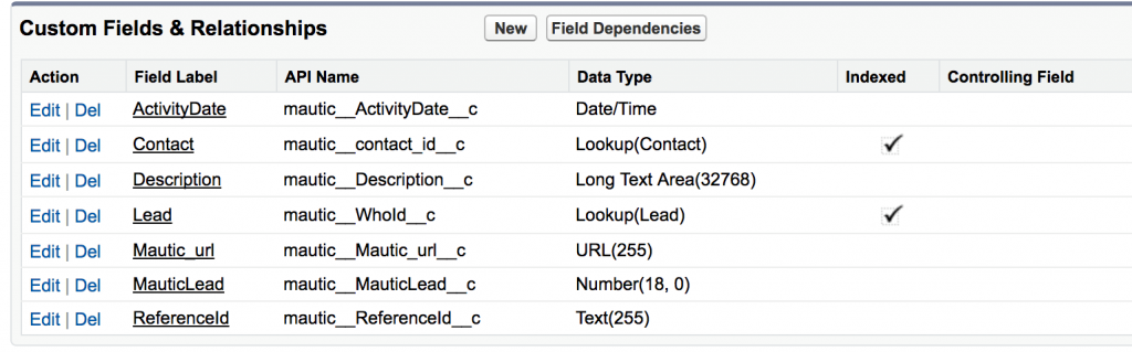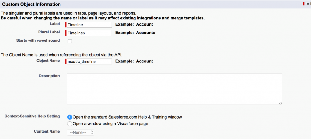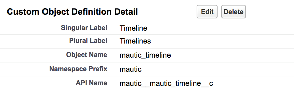Para poder impulsar las actividades de la línea de tiempo de contacto a la integración de Salesforce, primero debe configurar un objeto personalizado en su instancia de Salesforce. Por favor, configure el objeto como se describe a continuación. (Nota: estos son dos guiones bajos sin espacio entre ellos – no se hace bien en GitHub). En este ejemplo, Salesforce le ha dado al objeto personalizado un nombre de espacio nombre = ‘Mautic__’. Describiremos el nombre de los campos y el objeto que resulte después de completar el proceso de creación del objeto personalizado.