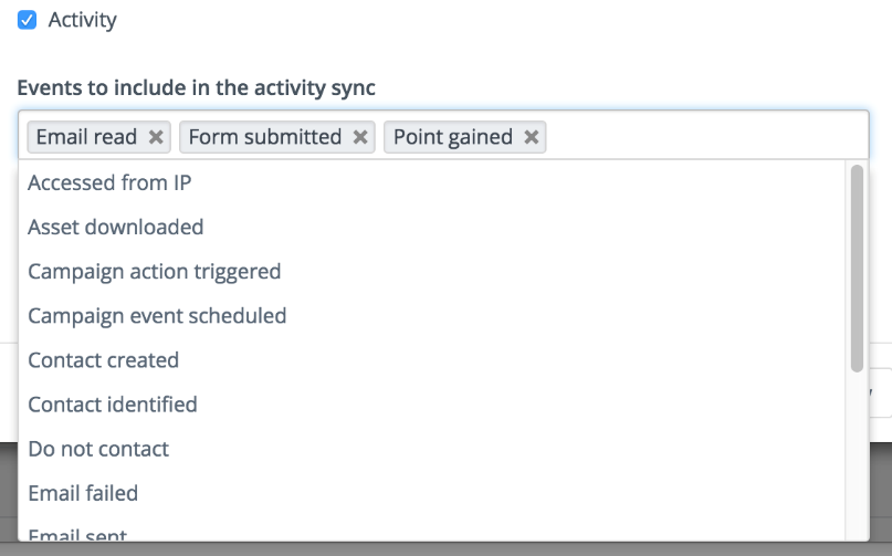 Puede filtrar qué actividades de la línea de tiempo de contacto enviar a su objeto personalizado en Salesforce utilizando el selector Eventos a incluir en la sincronización de la actividad. Si se deja en blanco, todos los tipos de actividad se enviarán a su objeto de actividad en Salesforce.