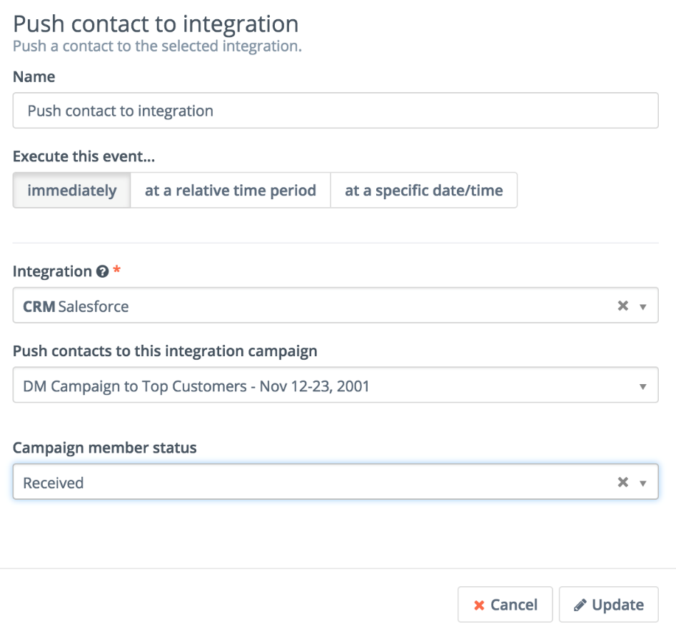 En una campaña puede elegir enviar contactos a una campaña de Salesforce específica, desde la ventana de configuración que puede seleccionar la campaña y el estado que desea que tengan los miembros de su campaña cuando se inserten en la campaña de Salesforce. Siga un procedimiento similar para una acción de formulario para impulsar la integración de Salesforce.