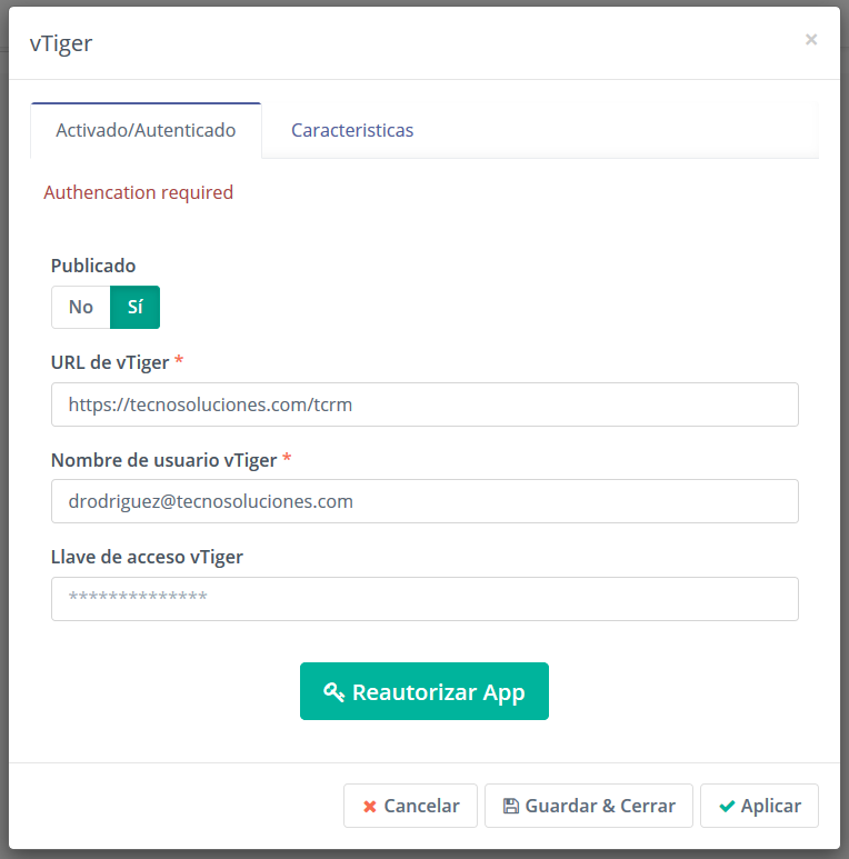 Para autenticar el complemento de TecnoMatic para poder comunicarse con vTiger CRM, necesitará estas credenciales: